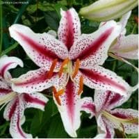 Лилия Диззи, относящаяся к группе ОТ-гибриды, поистине уникальна! На ее метровом цветоносе с наступлением июля расцветает от 5 до 8 огромных бутонов, размер которых достигает 25 см в диаметре! Каждый цветок лилии – это шесть лепестков с изящно отогнутыми кончиками. На белоснежном фоне лепестков ярко выделяется вишнево-винная полоса, разбавленная пурпурно-красным крапом, а из самого центра соцветий гордо смотрят стройные тычинки с ярко-оранжевыми пыльниками.